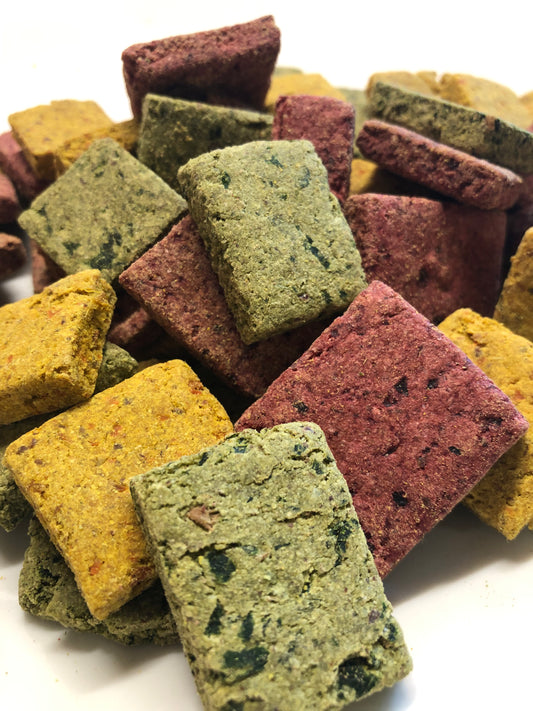 My pup loves these so much! Not only do I feel as if I can see an improvement in both her coat and overall energy but they also work great as a reward treat too! The best part is they are made with love and care!